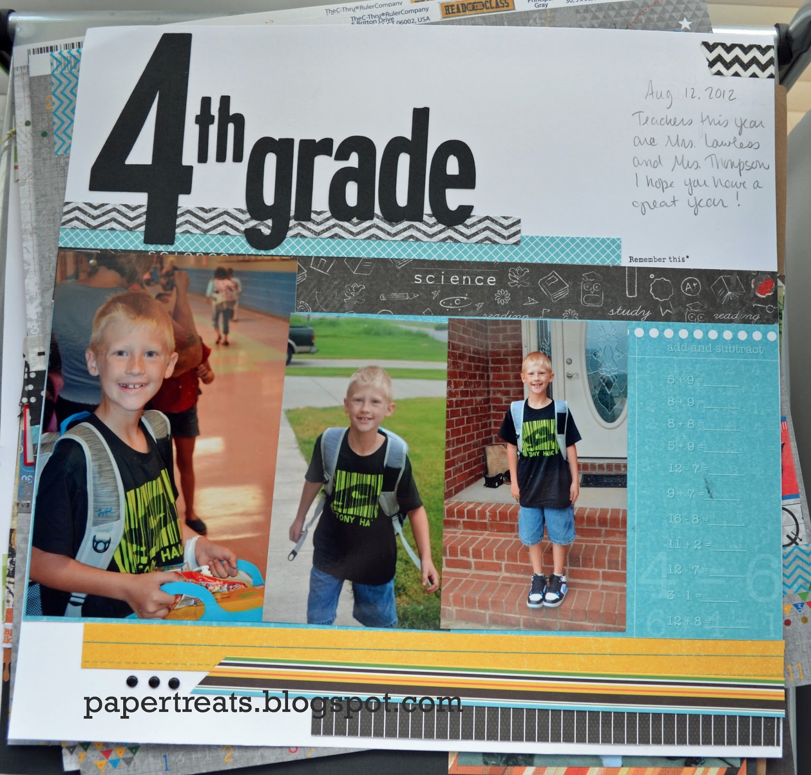 I managed to make all three layouts this week! Yeah for me! I used papers from LYB Head of the Class, and Generation Z collections. Both were double sided, so I was able to use both sides. Also papers from Echo Park Everyday Eclectic and one very old sheet of Reminisce Stripestock collection! The rubons are the A, B, and C and are used from three different collections. Other products are; Dear Lizzy stamp, Paper Studio brads and washi tape, American Crafts Thickers, and Cricut Street Sign.